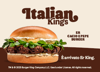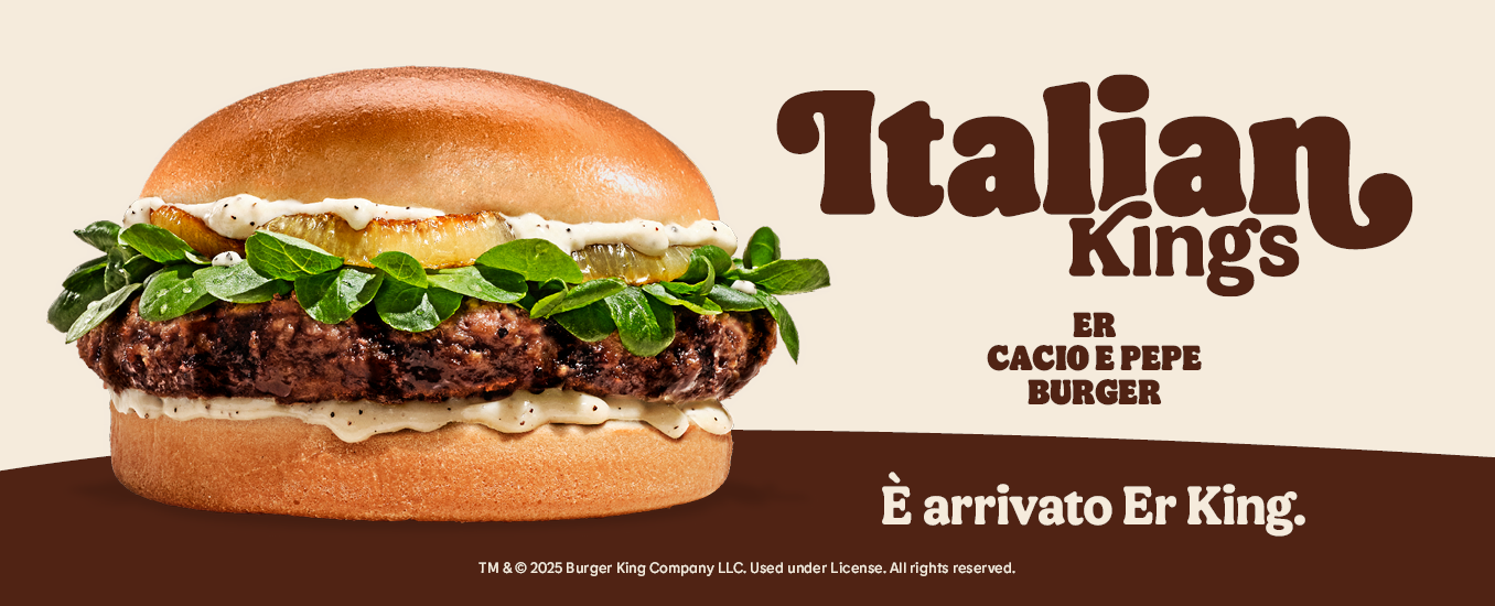 Il burger con carne alla griglia da allevamenti italiani, soncino, cipolle fresche fritte e salsa cacio e pepe.