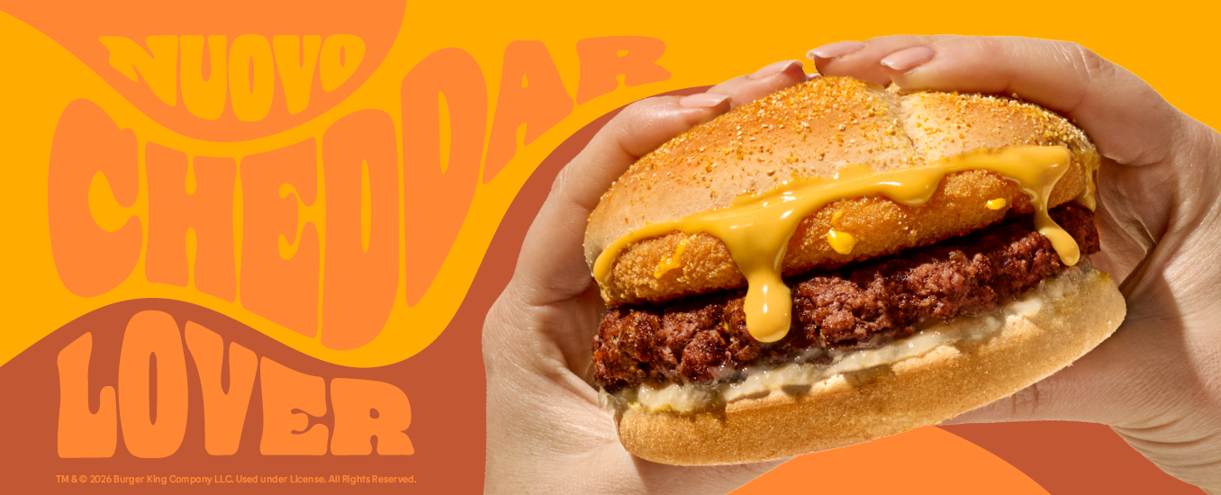 Il Nuovo Cheddar Lover è pronto a conquistare ogni amante del formaggio grazie al suo medaglione di cheddar fuso e alla salsa cheddar. Cheese Lover, vi aspettiamo in tutti gli store Burger King.