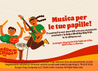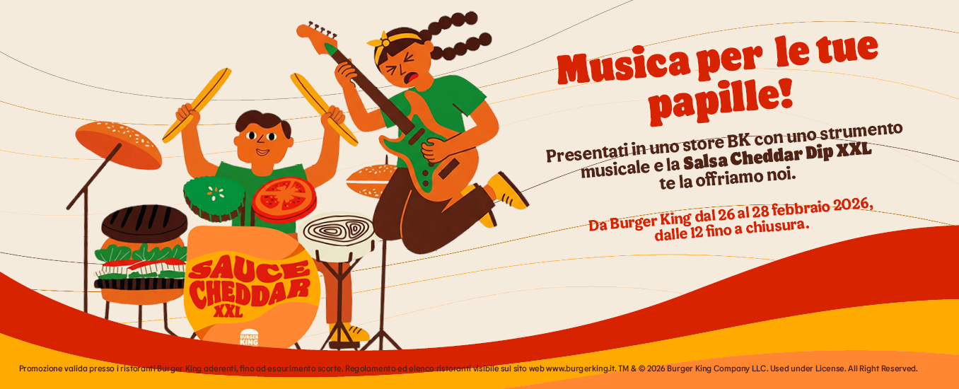 Dal 26 al 28 febbraio 2026, dalle 12 fino a chiusura, presentati in uno store BK con uno strumento musicale e la Salsa Cheddar Dip XXL te la offiramo noi!