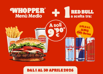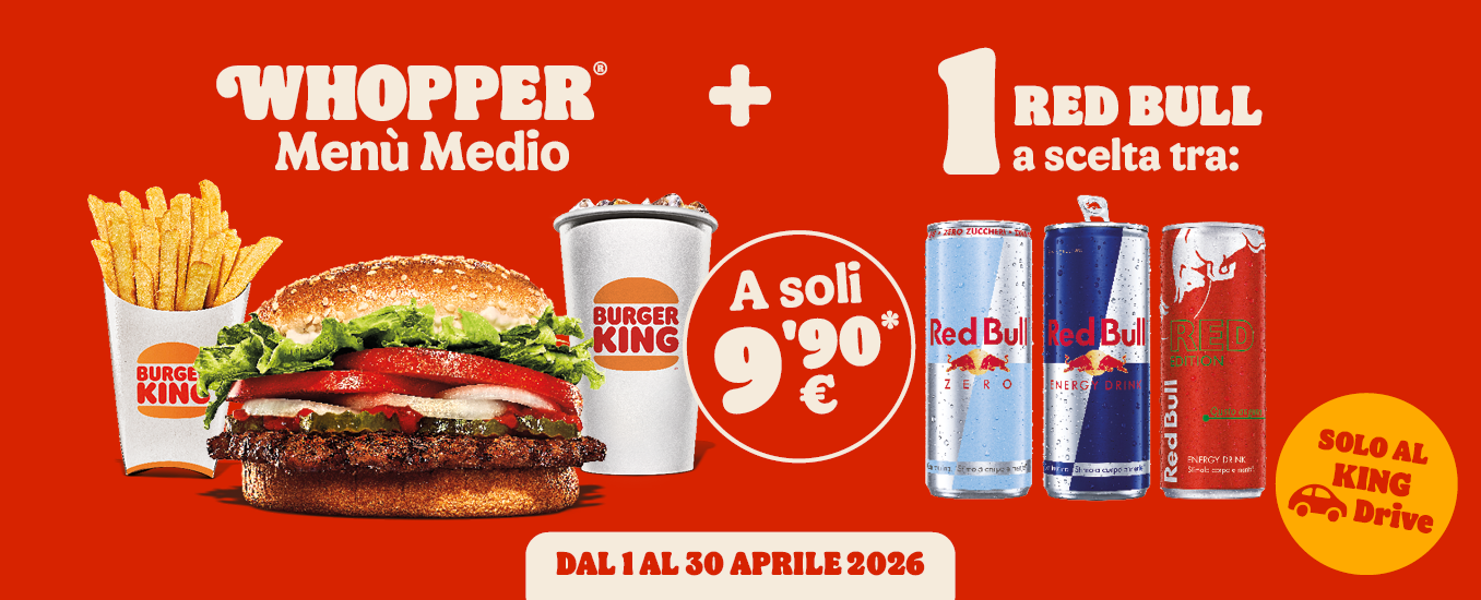 Una super promozione ti aspetta, solo al King Drive: un Whopper Menù Medio + una Red Bull a tua scelta a soli 9,90€!