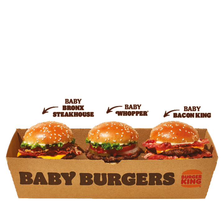 Siamo arrivati, BABY. Prova la nostra nuova box con tre icone di Burger King in formato mini ma con lo stesso carattere da King: Baby Bacon King, Baby Whopper e Baby Bronx Steakhouse.