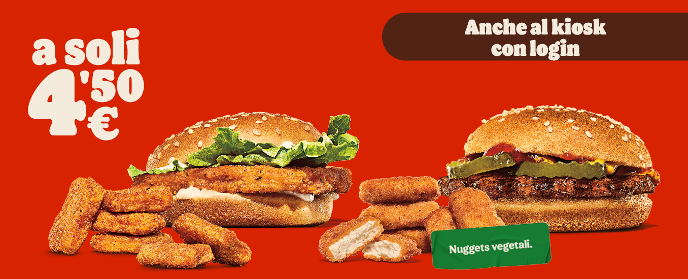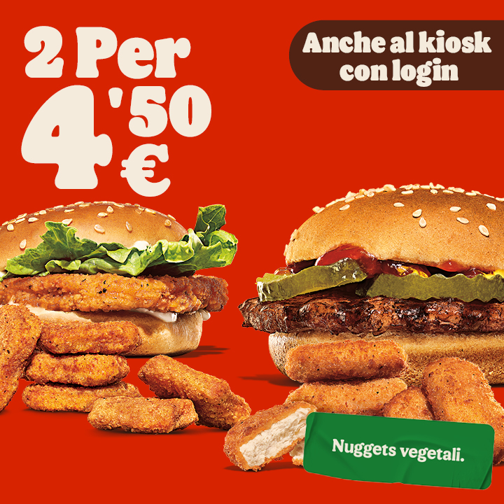 Gusta un’offerta imperdibile: ordina ora due prodotti a scelta tra Hamburger, Chicken Burger, King Nuggets* x6 a soli 4,50€!