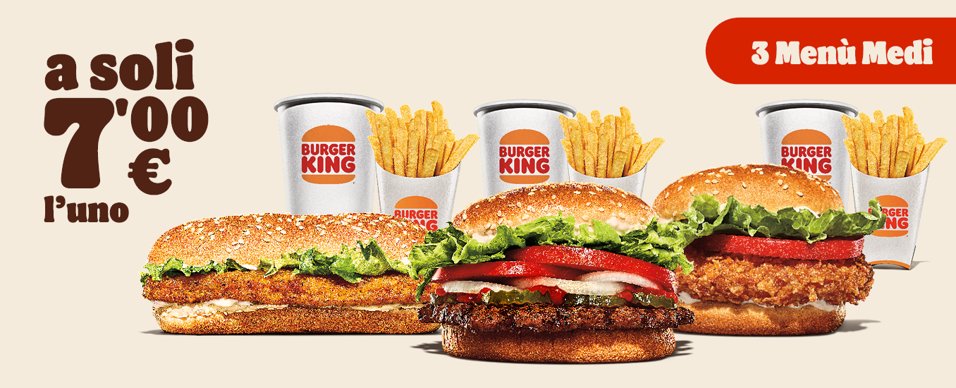 Acquista 3 Menu medi a scelta tra: - Big King - Crispy Chicken - Chicken Royale - Whopper - Gustalo anche Plant Based - Crispy chicken Wrap