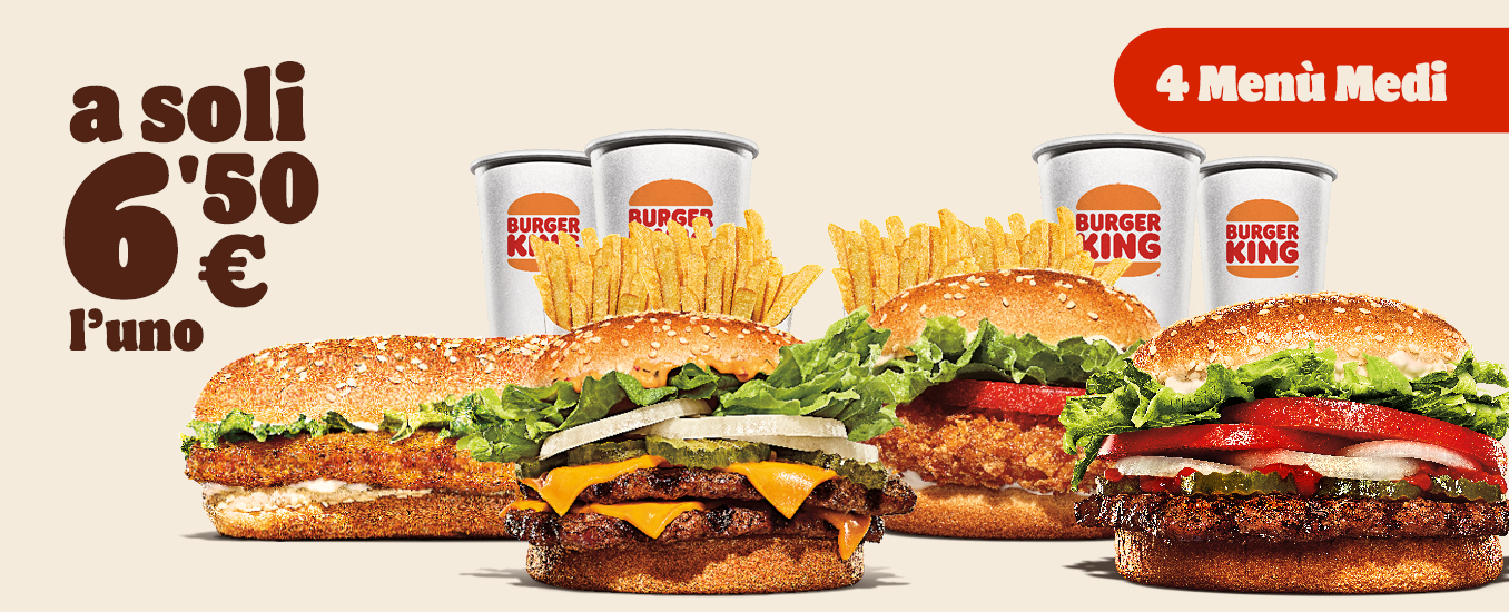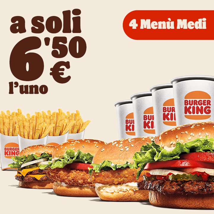 Acquista 4 Menu medi a scelta tra: - Big King - Crispy Chicken - Chicken Royale - Whopper - Gustalo anche Plant Based - Crispy chicken Wrap